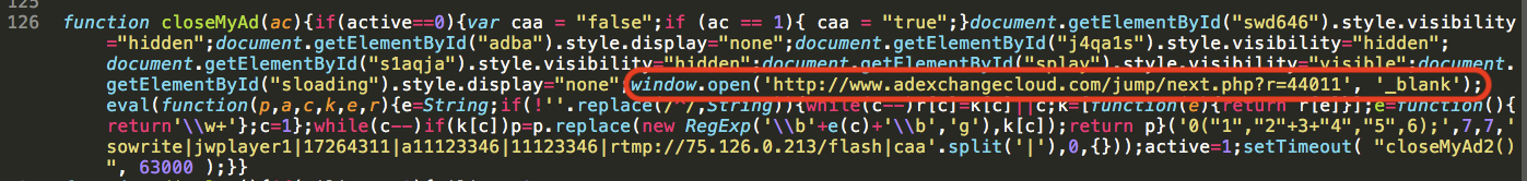 The site is embedded with player/content from sawlive[.]tv, which delivers more adware. These sites serve JavaScript obfuscated using JSF*ck, an encoding mechanism that uses only six characters to express any character. Here, 5,518 characters were sent as part of a response and, when deobfuscated, resulted into only 10 characters (“sawlive[.]tv”).