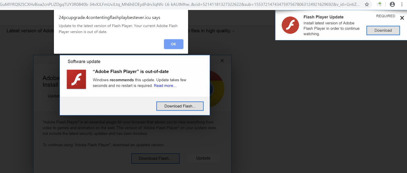 Whenever the user attempts to click or close the ad, a new browser tab is opened with a request to http[:]//www[.]adexchangecloud[.]com/jump/next[.]php?r=44011, which prompts the user to install a fake browser plugin or scareware alerts or additional adware. One of the ads redirects to fake “Adobe Flash Player” update as shown below: