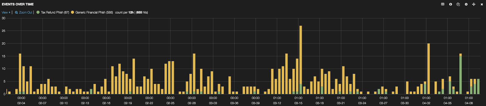 Figure 1: Financial (gold) and tax refund (green) phishing events over the past two months