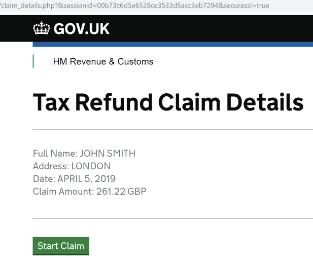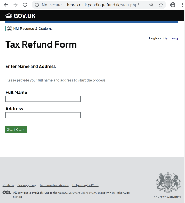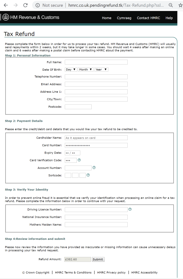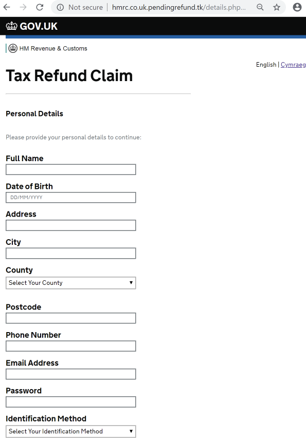 Tax year in the UK has just ended (April 6) and scammers have been preparing to take advantage of users seeking their refunds. One of the phishing domains we have been monitoring, hmrc[.]co[.]uk[.]pendingrefund[.]tk, updated its phishing pages on April 6 to keep up with tax season events. It began with a refund claim form and was changed to a form for "processing" the claim and applying it to the user's credit card.