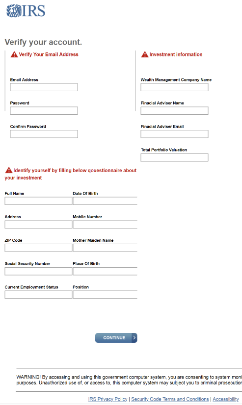 Though the majority of phishing sites were for "generic" financial institutions, we did see IRS phishing websites, including the following, which asks the user to enter an email address and then redirects to verify the account and fill in additional information including Social Security Number.