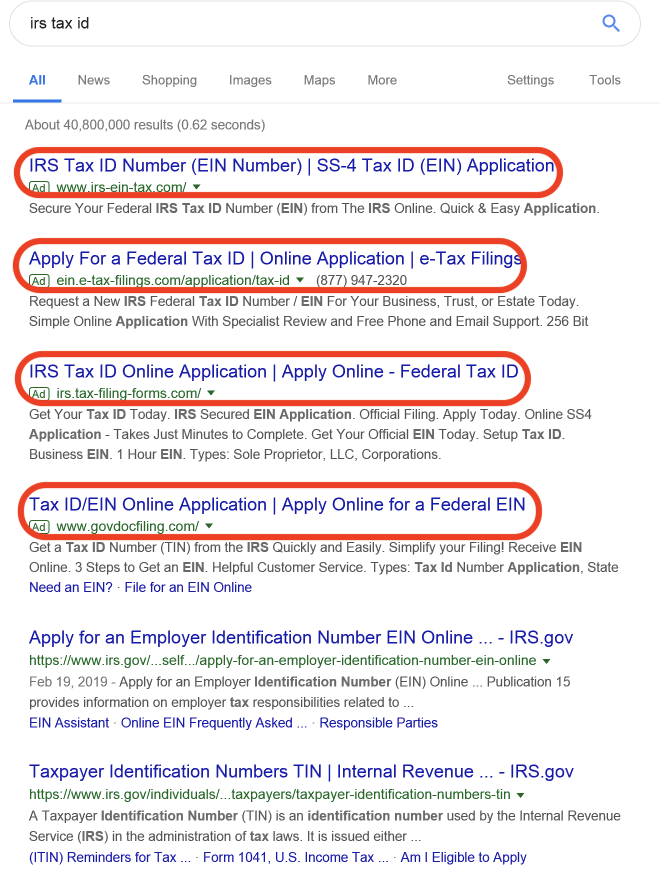 A Google search of “irs tax id” resulted in multiple scamming websites among the top ads.