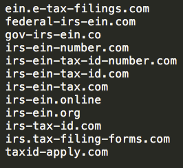 Here are a few of the domains that are active in luring users to apply for an Employer Identification Number (EIN).