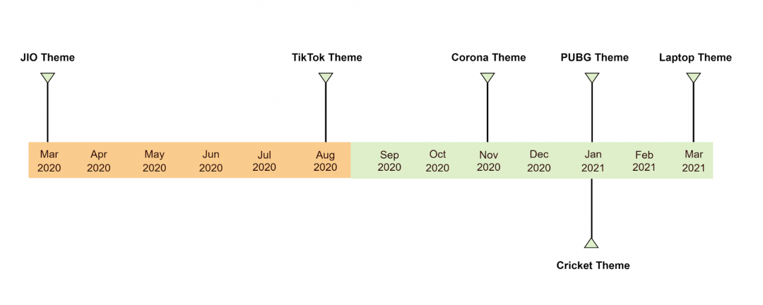 The graphical timeline below shows the different themes used by the threat actor over a period of time.