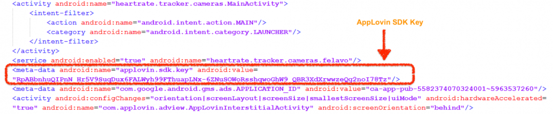 Figure 12: AppLovin SDK key configured in AndroidManifest.xml file