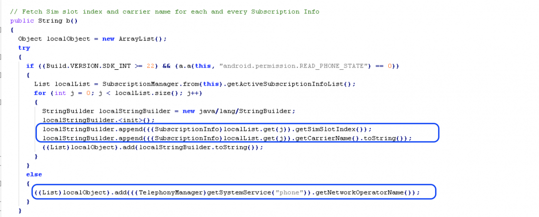 - If Android SDK version >= 22 and READ_PHONE_STATE permission is granted, then fetch Sim slot number and Carrier name else fetch the operator names corresponding to the SIM cards on the current device.