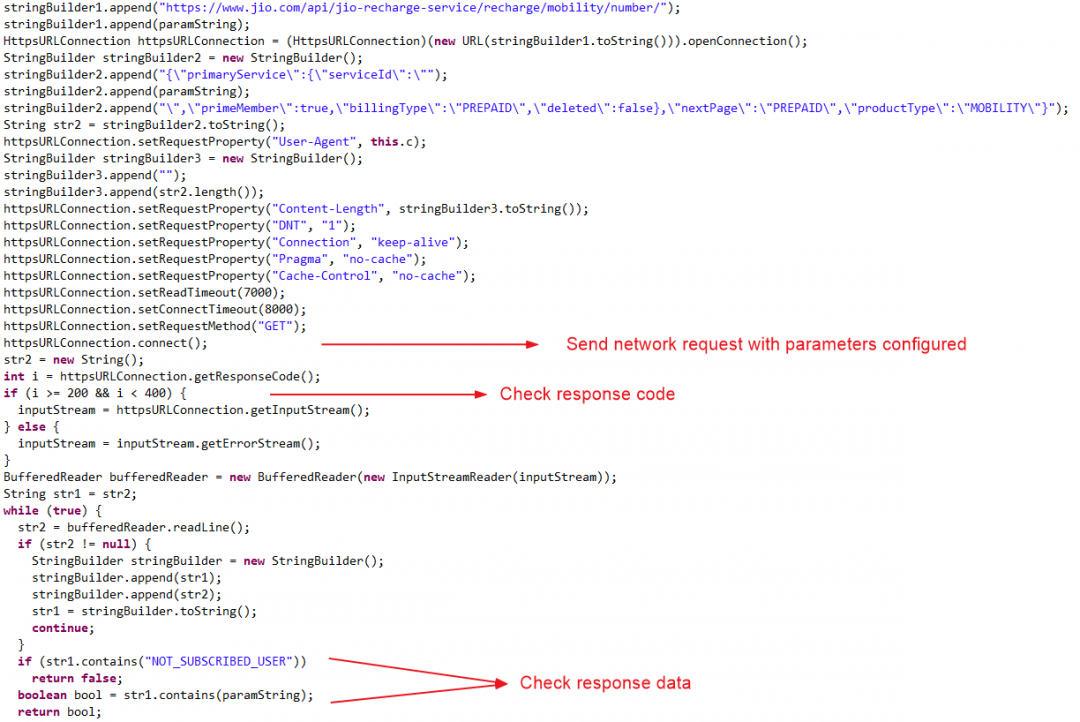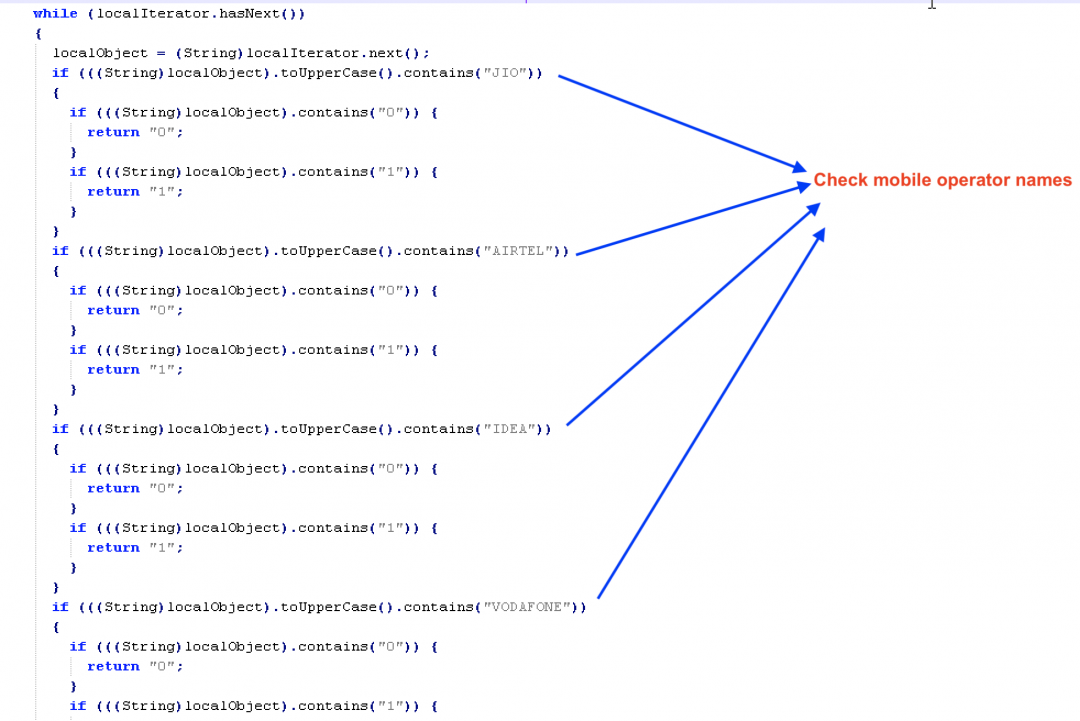 The spreading operation performed by the service is through SMS. Currently the malware targets only JIO customer base. Before sending the SMS to any number in the infected device’s contact list, the malware confirms that the operator is JIO. Methods of identification are explained under the Contacts Operator Identification section.