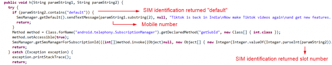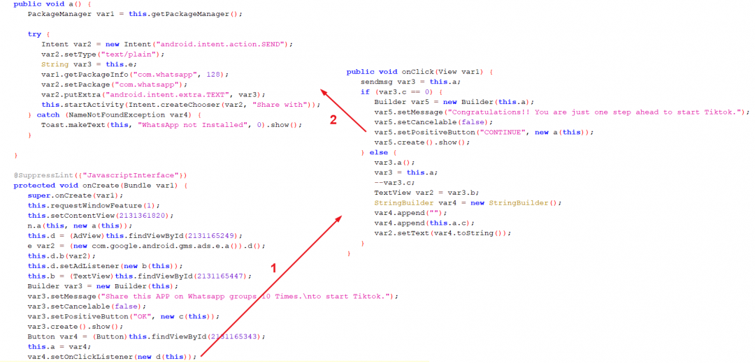 If the check passes it shows a Popup message to start TikTok which when clicked calls the sendmsg.class