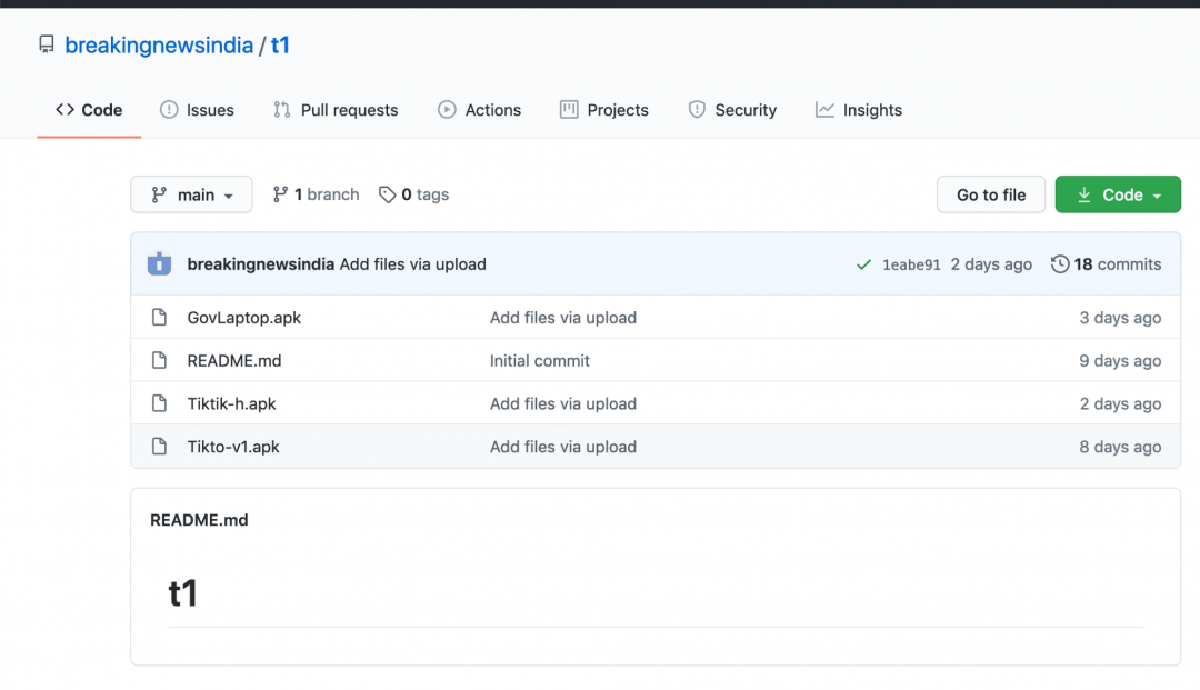 This webpage misinforms the user that the TikTok application is available again in India and lures them to download it. The actual APK file is hosted on an attacker-controlled GitHub account.