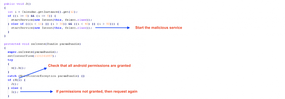 - Starts the malicious service from “felavo.class” when permissions are granted