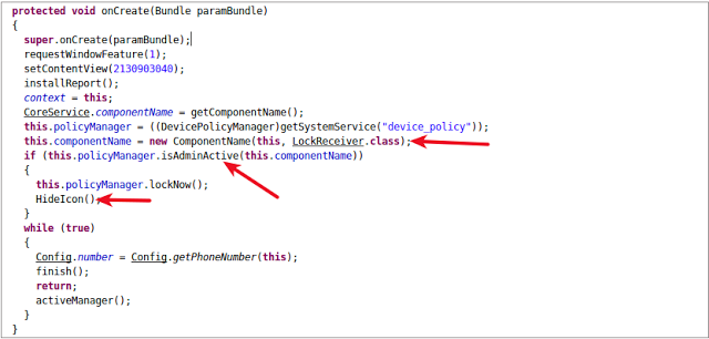 Once the administrator rights have been granted, the malware hides its icon, making the victim think that the app must have been removed or deleted. The screenshot below shows the code exhibiting this functionality: