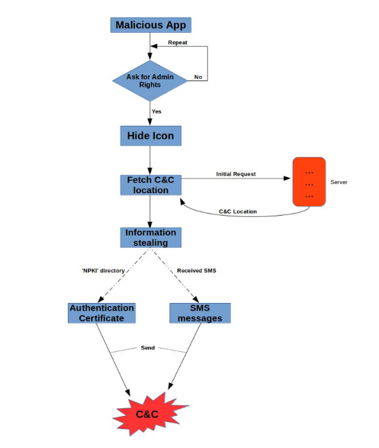 The malware poses as the “V3 Mobile Plus” application and asks for administrator rights upon launch. After claiming admin rights, it hides itself, which makes victim think the app has been removed/deleted from device. In reality, the app asynchronously runs services in the background, hidden from user view. The main purpose of the malware is to steal the victim’s SMS messages and authentication certificates used in the National PKI (Public Key Infrastructure) scheme, and send it to its C&C (Command & Control) server.