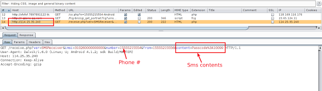 After the location is received and extracted, the malware is up and running, ready to steal the SMS message as soon as it arrives on the device. A request, along with the device's IMSI number, phone number, and contents of the SMS message are sent to C&C.