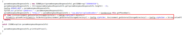 The malware in our analysis has been designed to steal these authentication certificates stored in a victim’s device. It looks for an NPKI folder in the device and, if found, the malicious app compresses the content of the folder and sends it to C&C server. Note that the C&C location is the one sent in the first request. The following screenshot shows the functionality in action: