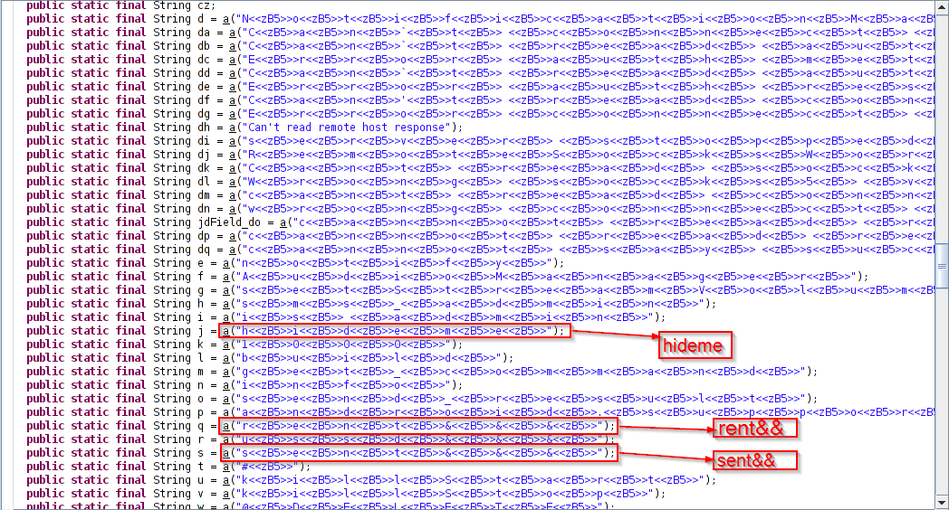 In the current variant, we have observed a new obfuscation technique, in which all important string characters are delimited with '<<zB5>>' as shown below.