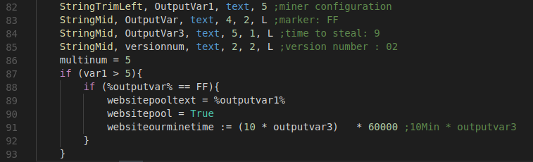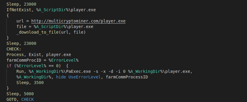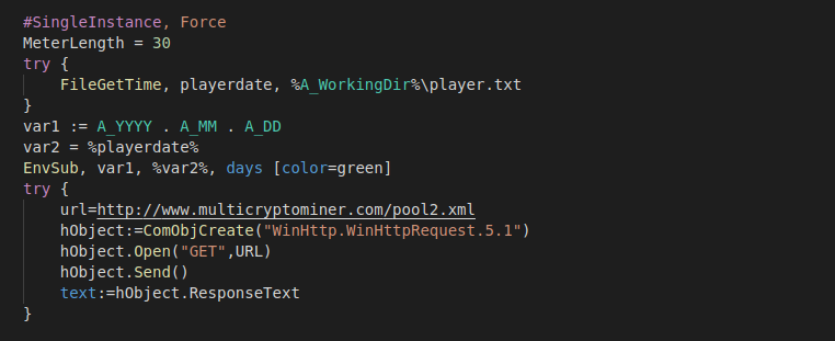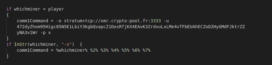But that was not enough, the author also added a backdoor functionality to mine cryptocurrency for his own address in the mutlicryptominer binary. It will check the modified timestamp of player.txt, and if that file is more than five days old, it will get latest config from multicryptominer[.]com/pool2.xml.