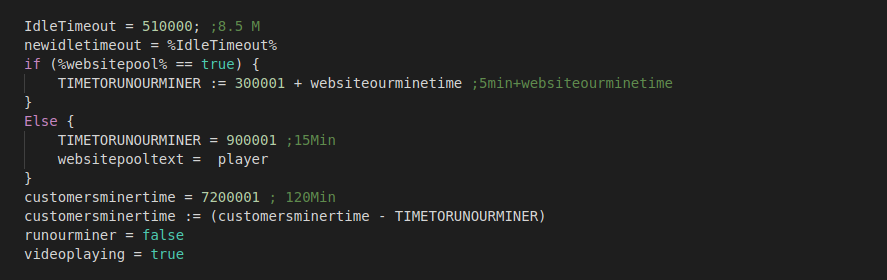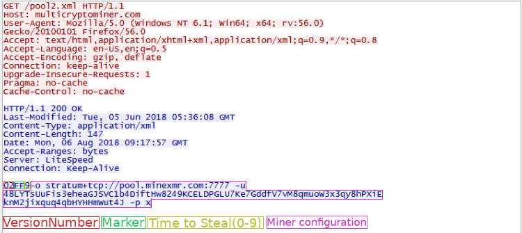 In case the server did not respond with the proper configuration, or player.txt is not more than five days old, it will run the second level malware operator's miner for 105 minutes and author’s for 15 minutes; otherwise, it will distribute time among mining addresses depending on a value received from the server. At the time of analysis, the server was sending the maximum possible value of nine, which means it is splitting mining time between author and customer in a 3-to-1 ratio (90 minutes for author and 30 minutes for customer).