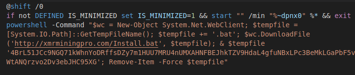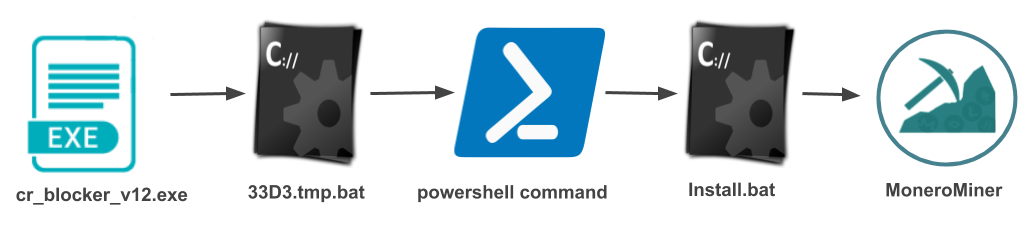 The first malware variant was getting downloaded with file names like 'cr_blocker_v12.exe', 'apollo.exe' and was making extensive use of batch files. First it will drop and execute a batch file , which in turn, runs a PowerShell command (a slightly modified version of the PowerShell script from http://moneroocean[.]stream) to download and execute a batch script (again a copy of moneroocean's xmrig_setup.bat) from same website.  The purpose of final batch script is to download, setup and run monero miner on infected system.