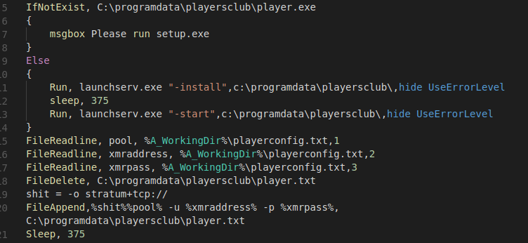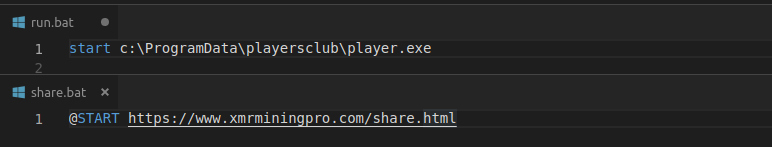 Batch files are just one-line scripts in this case as seen below; run.bat will run c:\ProgramData\playersclub\player.exe and share.bat will open xmrminingpro[.]com/share.html in an attempt to convince the user to share this website on social media sites - Twitter, Facebook and Google Plus - resulting in further infections.