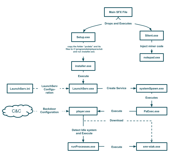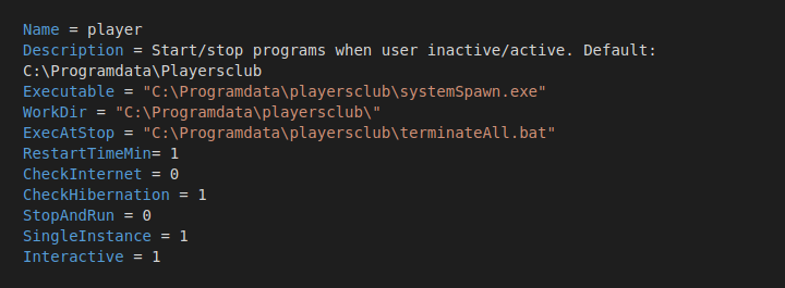 systemSpawn.exe is registered as a service with the purpose of ensuring player.exe exists in the C:\programdata\playersclub\ folder and, if not download and run it with escalated privileges using PaExec.exe (similar tool to Microsoft's PsExec) from poweradmin[.]com/paexec/.