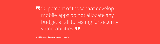 A study by IBM & The Ponemon Institute shows that, of the 400 organizations studied, almost 40 percent do not scan the apps they develop for security vulnerabilities. Of those that do scan their apps before releasing them to market, only 15 percent test them as frequently as they should. And, even more worrisome, 50 percent of those that develop mobile apps do not allocate any budget at all to testing for security vulnerabilities.