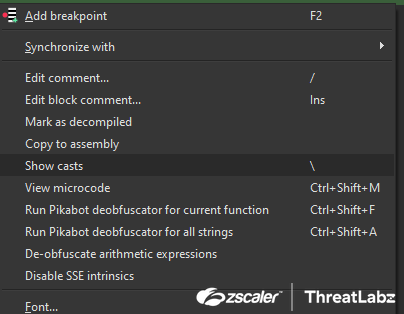 - Zscaler ThreatLabz developed an IDA plugin to automatically decrypt Pikabot’s obfuscated strings and are releasing the source code.
