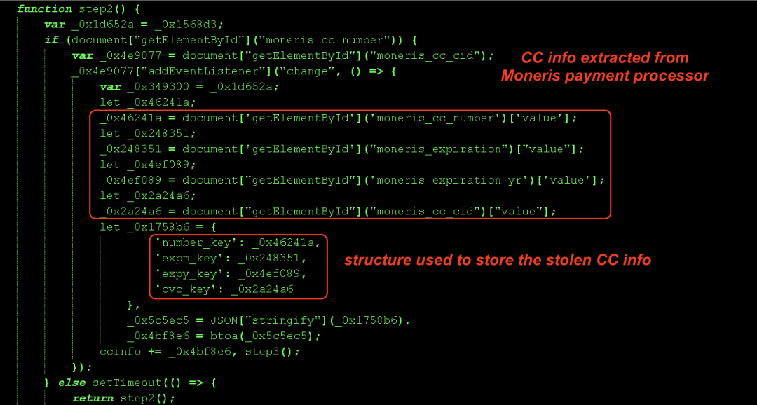 Figure 2 shows the relevant skimmer code searching for Moneris payment info
