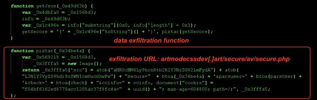 6. Exfiltrates the information using the pixtar() function which creates an image tag and sets the source to the exfiltration URL: artmodecssdev[.]art/secure/av/secure.php. After exfiltration, it sets the cookie  "f04bf6162ed8779acc1205ac37f8fc4a" to the uuid. This uuid is generated by the script client-side.