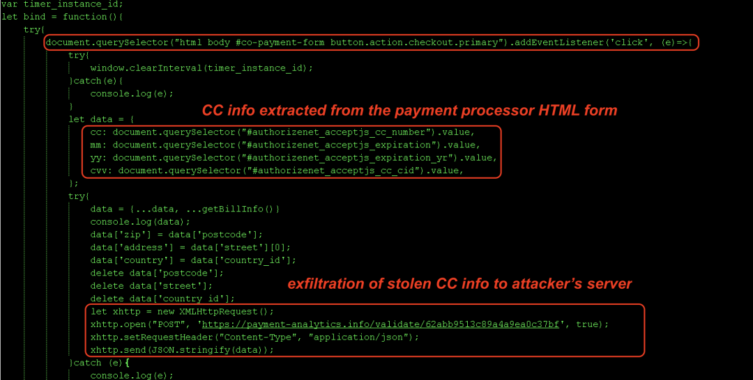 The skimming code itself is straightforward. It captures the credit card information by searching for HTML fields corresponding to the payment processor used by the targeted store (in this case - Authorize.Net). The collected information is exfiltrated by sending an HTTP POST request to payment-analytics[.]info/validate/<random_id>