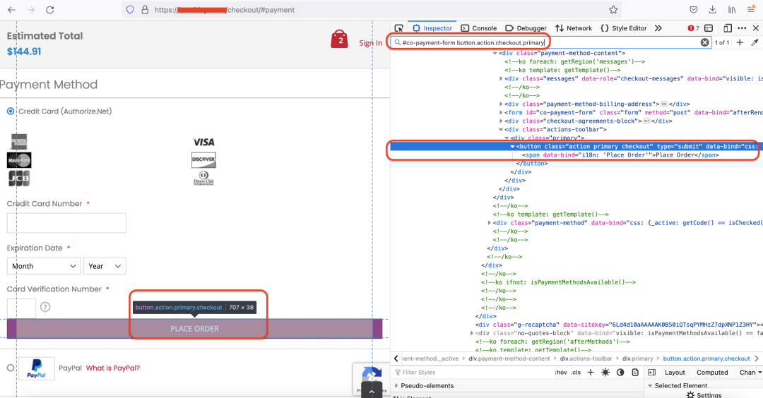 1. Adds an event listener for the click event on "place order" button by locating the HTML button element with id and class: "#co-payment-form button.action.checkout.primary". Figure 5 shows the corresponding elements on the checkout page.