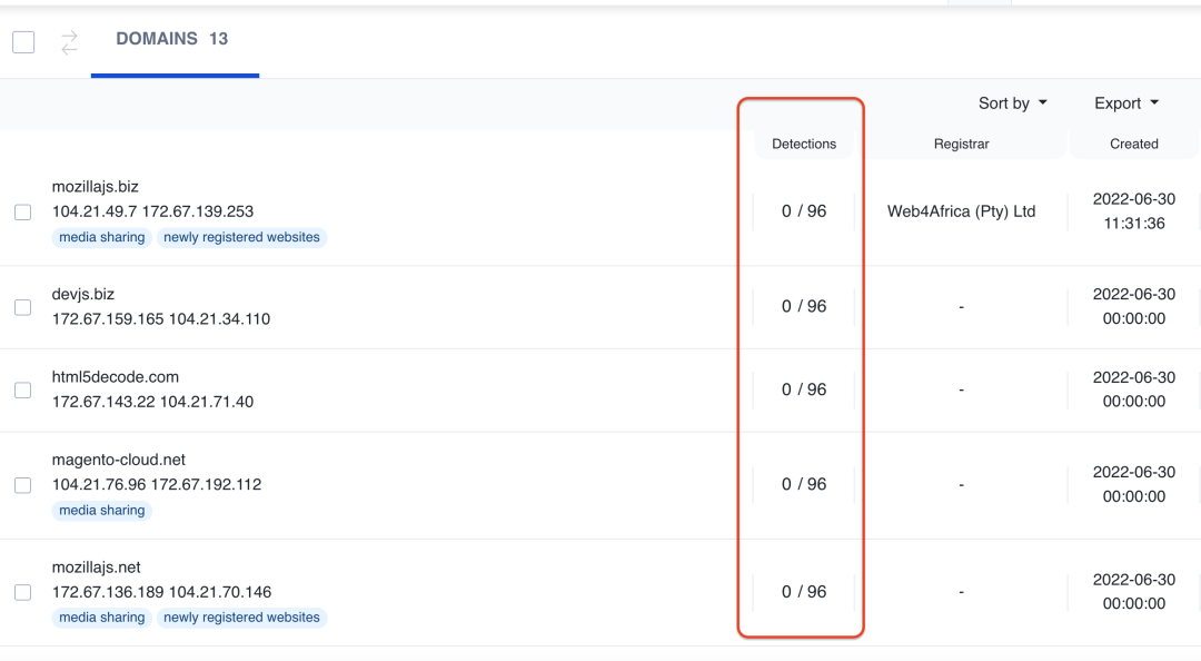 Figure 6 shows that most of the domains used in this campaign are still undetected on VirusTotal which explains the long shelf life of this campaign.