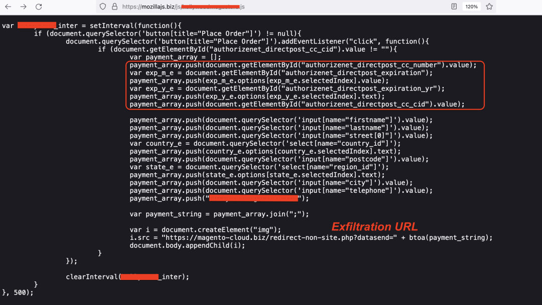 1. Uses the setInterval() function to check every 1.5 seconds whether the current URL contains the string "/checkout/#payment". This string corresponds to the checkout page of the compromised e-commerce store and indicates that the user is ready to purchase the items added to the cart.