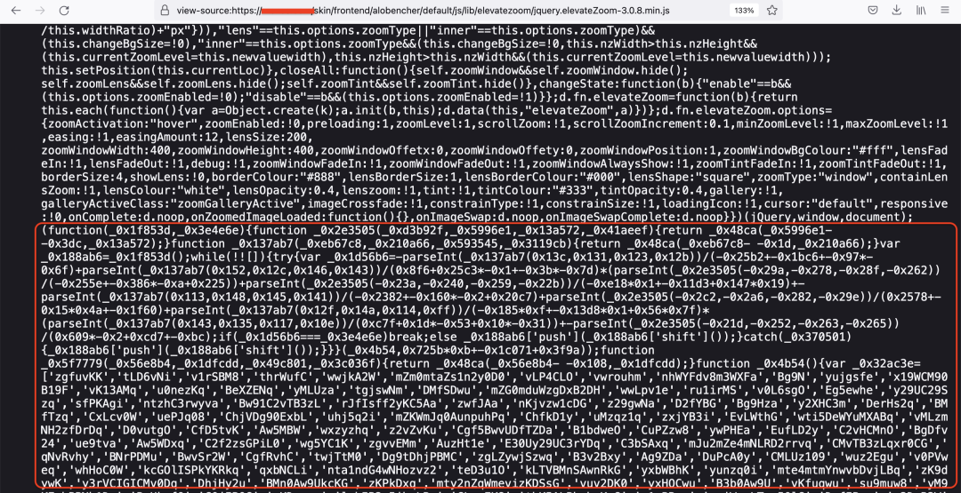 For the purpose of technical analysis, we will take an example of an obfuscated JS skimmer which was injected in the path: /skin/frontend/alobencher/default/js/lib/elevatezoom/jquery.elevateZoom-3.0.8.min.js on a compromised store as shown in Figure 9.