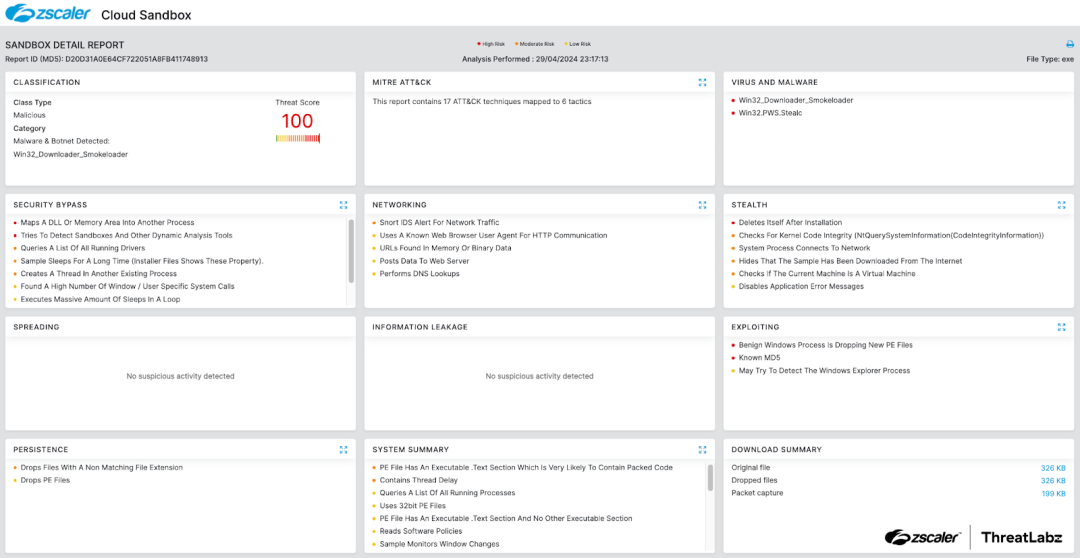 In addition to sandbox detections, Zscaler’s multilayered cloud security platform detects indicators related to SmokeLoader at various levels with the following threat names: