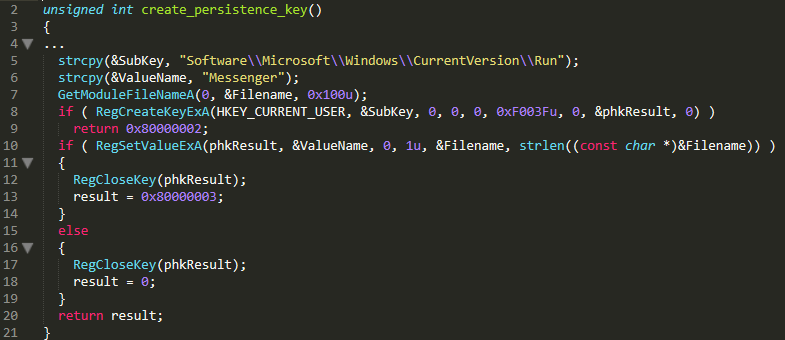 Figure 7 - Simplified decompiled code for the persistence mechanism shows the Run key utilized