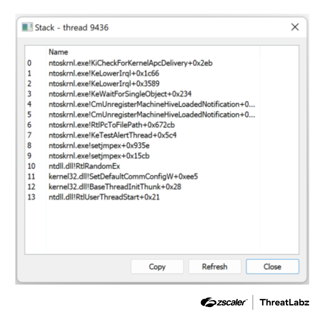 The figure below shows an example of a call stack when the function RtlRandomEx is called from CoffeeLoader using call stack spoofing. Note that the CoffeeLoader module does not show up in the call stack. The frame labeled kernel32.SetDefaultCommConfigW+0xee5 is the address of the jmp rbx gadget.