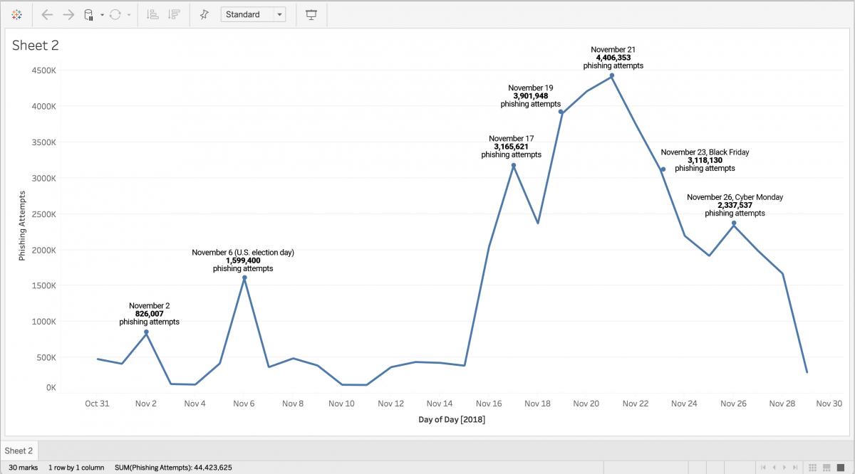 We also know, as we stated earlier, that today’s cybercriminals plan their campaigns with a marketer’s precision. It’s wise to take extra precautions leading up to and during big events or news days (another day in November when we saw a surge in phishing activity was the sixth, the U.S. election day).