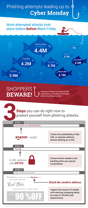 With so much shopping activity, you might think that Black Friday and Cyber Monday would be the days that cybercriminals would crank up the volume, launching phishing attacks and spreading malware to online shoppers. But the traffic patterns on our cloud show otherwise.