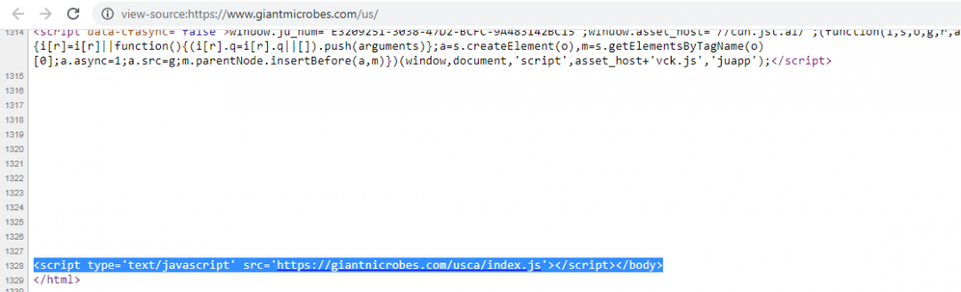 3. Skimmer groups generally use the newly registered domain to infect multiple e-commerce websites but this is not always the case as we have seen that few Magecart groups targeting specific e-commerce websites register a malicious domain lexically close to the target website. “Giantmicrobes”, a toy company that offers lots of goods related to healthcare has been a victim of this attack as well. Below is a screenshot of the source code from Giantmicrobes website. The screenshot shows a highlighted reference to an external JavaScript file and the domain looks legitimate but taking a closer look reveals that it is lexically close to the legitimate domain.