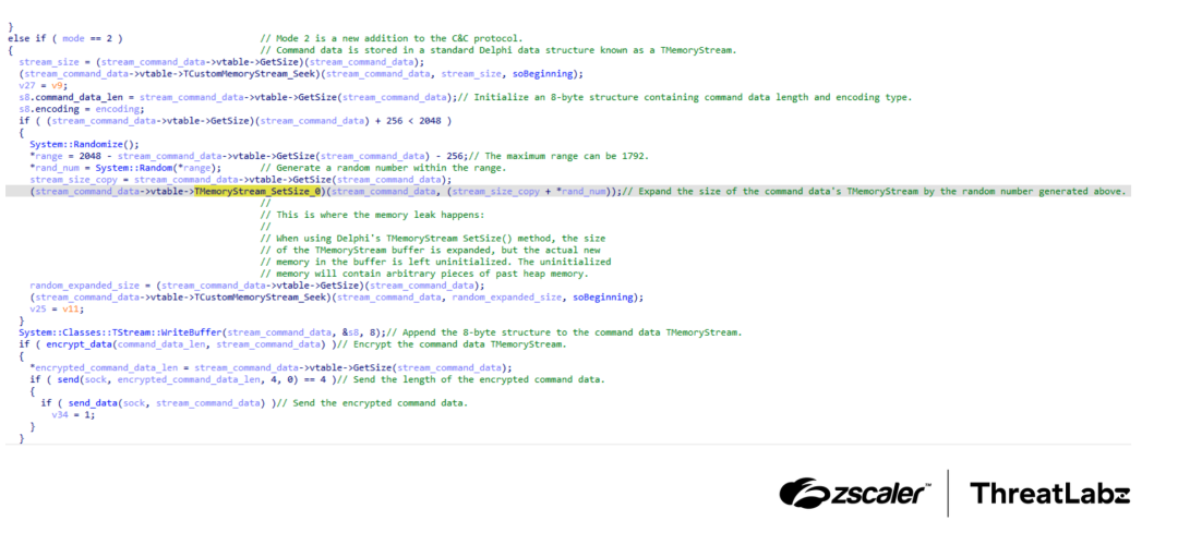 DanaBot’s command data was stored in a Delphi TMemoryStream. A random number, capped at a maximum value of 1,792, was generated to determine the number of padding bytes to add to the command data buffer. While the size of the buffer was increased, the newly allocated memory within the buffer was not initialized. At first glance, this uninitialized memory appeared to be random, but closer inspection revealed that it contained arbitrary fragments of the C2 server’s process memory. This oversight in memory handling created the DanaBot vulnerability that exposed the group’s sensitive internal data.