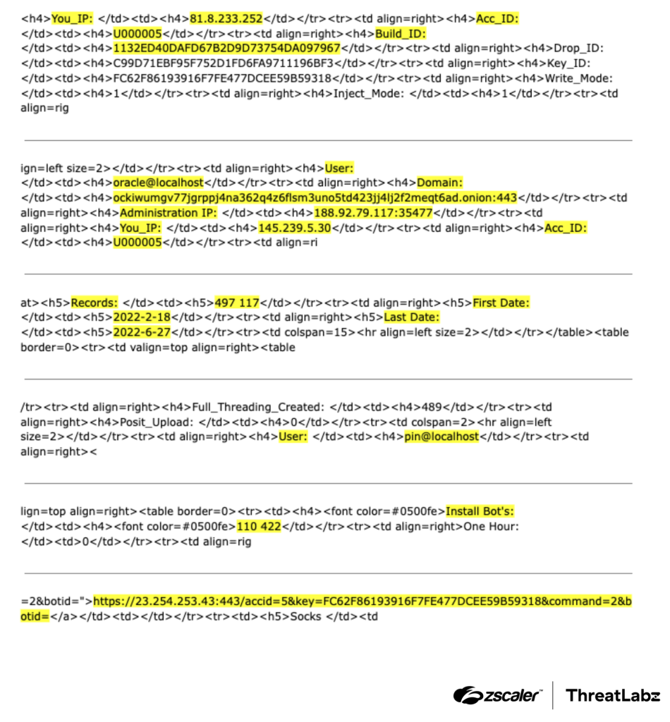 Some of the most intriguing leaks revealed HTML snippets associated with the C2 server's web interface. The figure below, with highlights added, provides a sample of these leaked elements.