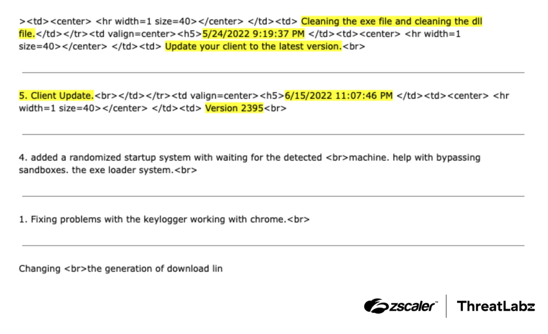 The DanaBot developer maintained a changelog of updates and some of those changes were also leaked, as shown in the figure below (highlights added).