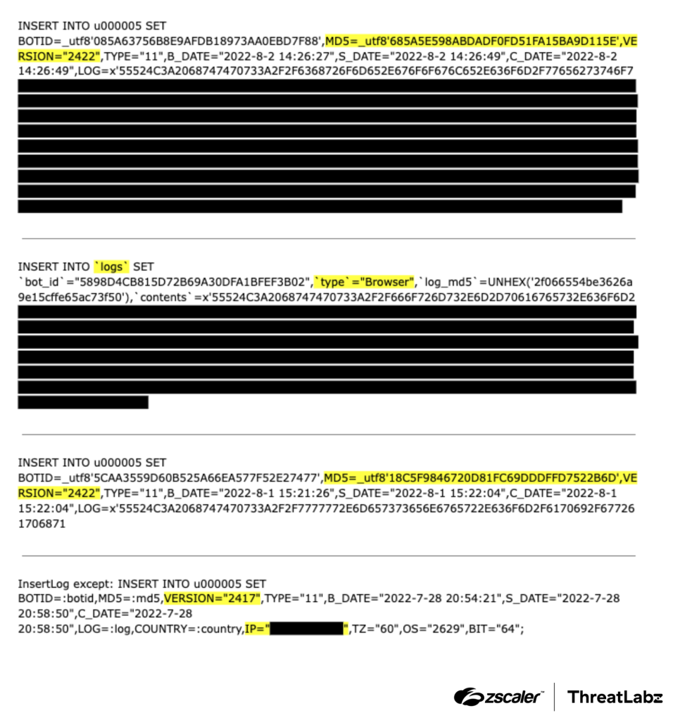 Another frequent type of leak involved SQL statements. These leaks offered valuable insights into the C2 server's database structure, including information such as malware MD5 hashes, version updates, and victim IP addresses. The figure below (with highlights added) provides an example of these leaks.