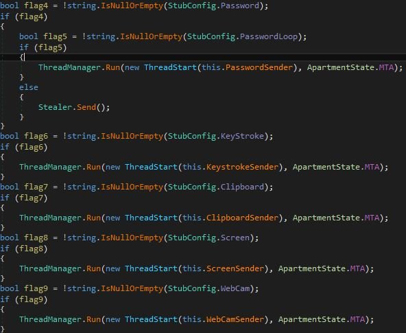 Before starting any logging functionality, it checks whether the respective logging functionality variable is set in the Stub config entry or not. If the value is not set in config, then it won't execute the "keystroke functionality". As shown in Figure 14, the Stub is configured to execute the keystroke but not the webcam as the webcam value is not assigned.