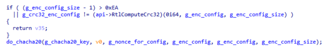 Old variants of StealthVector use a CRC32 hashing algorithm for integrity checks and ChaCha20 for decryption of the configuration.