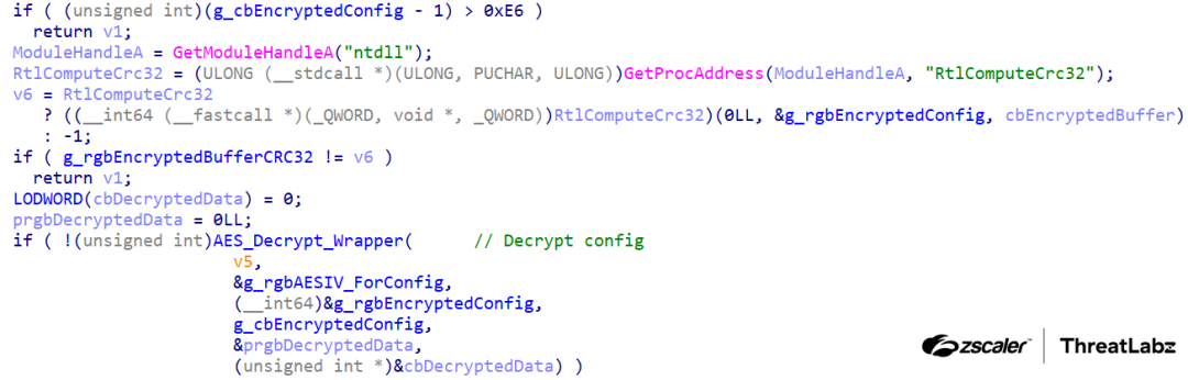 Figure 5: StealthVector uses the CRC32 hashing algorithm and AES-CBC algorithm for decryption.